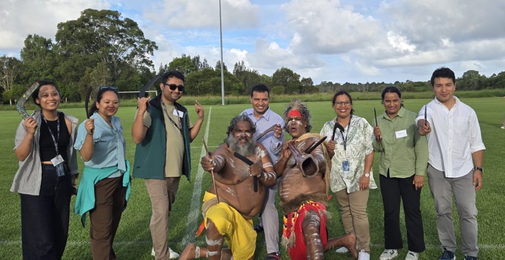 Lasata (far left, standing) pictured together with other Nepali participants after witnessing an Indigenous cultural experience during their time in Australia.